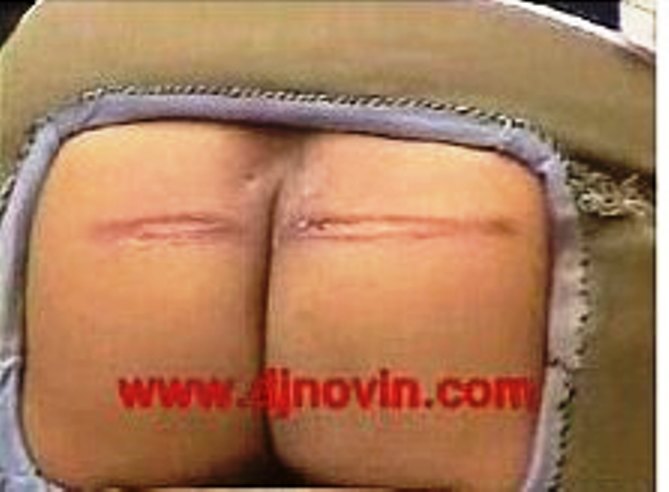 | นักโทษจะถูกนำเข้ามาในสภาพเกือบเปลือย มีผ้าเตี่ยวปิดกั้นด้านหน้า ด้านหลังเปิดก้นไว้อย่างนี้ เมื่อพันธนาการเข้ากับขาหยั่งแล้ว ก็จะมีเกราะหนังมาคาดทับ ป้องกันร่างกายส่วนอื่นที่ไม่ต้องการให้โดนฤทธิ์หวาย ตรงตำแหน่งก้นเจาะเป็นรูไว้ ดังภาพ