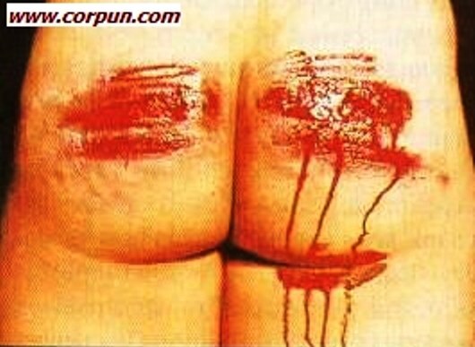 | เมื่อยกไม้ออก หนังกำพร้าจะหลุดตามออกไป เหลือเนื้อช้ำๆ ก่อนที่แผลจะเปลี่ยนเป็นสีชมพู แล้วก็แดง ก่อนจะเยิ้มเป็นโลหิต ใหลย้อยออกมา