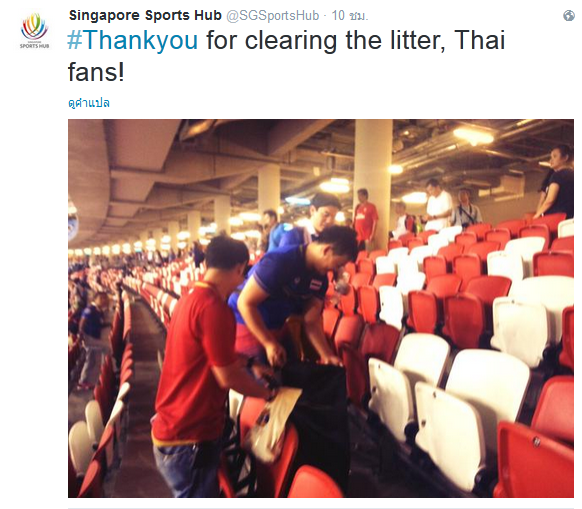 ทวิตเตอร์ของอุทยานกีฬาแห่งชาติสิงคโปร์ ทวิตขอบคุณแฟนบอลไทยที่ช่วยกันเก็บขยะในสนามฟุตบอลฯ