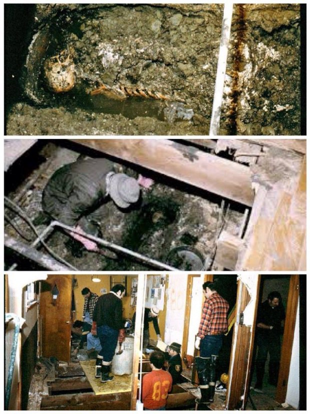 บ้านของจอห์น เกซี มีลักษณะพิเศษ มันสร้างคร่อมบ่อบำบัดน้ำเสยเก่าๆ เมื่อใช้เครื่องคุ้ยโคลน ก๊าซที่หมักหมมมานานก็พากันดันตัวออกตามรอยขุด หลายคนถึงกับอาเจียนจนทนไม่ไหว จนตำรวจต้องเรียกหน่วยชันสูตรและเครื่องมือเพิ่มเติม เมื่อหน่วยชันสูตรมาถึง การขุดค้นครั้งใหญ่จึงเริ่มต้น ร่างแล้วร่างเล่าถูกขุดมาวางที่ปากบ่อ ส่วนใหญ่เหลือเพียงกระดูก บางร่างมีกางเกงลิงอยู่ในปากหรือใช้เป็นเชือกรัดคอ พร้อมร่องรอยปูนขาวที่จอห์นใส่ไว้หลายร้อยกิโลเพื่อเร่งการย่อยสลายของศพยัดจมลงในโคลนเบื้องล่าง