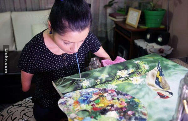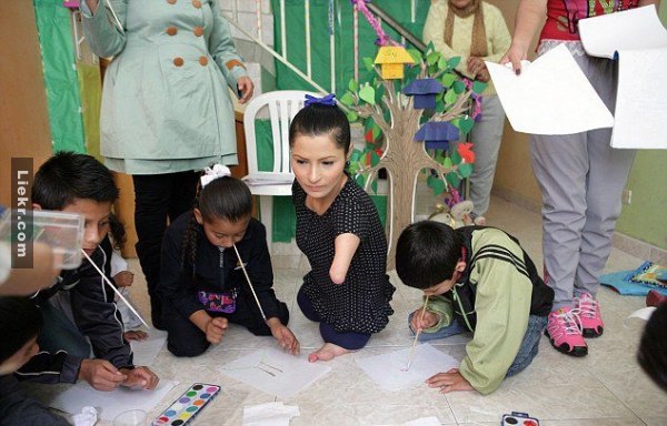 เธอสอนเด็กๆวาดภาพโดยการใช้ปากจับพู่กัน เพื่อให้เด็กๆได้เข้าใจว่าการไม่มีมือนั้นจะมีความรู้สึกยังไง