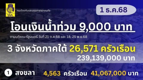 เงินเยียวยาน้ำท่วม 9,000 บาท เข้าบัญชีวันนี้! 3 จังหวัดใต้ สงขลา สตูล และ ปัตตานี รวม 26,571 ครัวเรือน