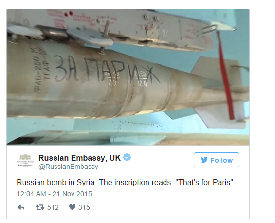 ทหารอากาศรัสเซียได้สลักข้อความว่า "Russian bomb in Syria. The inscription reads: "That's for Paris" ลูกนี้สำหรับปารีส" ซึ่งคาดว่าระเบิดลูกนี้ จะใช้ถล่มกลุ่มไอเอสในประเทศซีเรีย