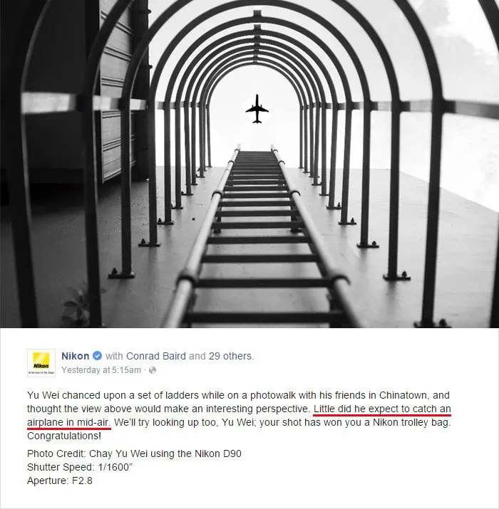 เมื่อ Nikon ประกาศรางวัลภาพถ่ายของ Chay Yu Wei ที่จับภาพเครื่องบินที่บินผ่านเหนือศีรษะได้อย่างพอดิบพอดี ปัญหาเกิดขึ้นเมื่อคนอื่นๆมองออกว่า มันเป็นภาพโฟโต้ช็อปเอาเครื่องบินมาใส่ไว้นั่นเอง