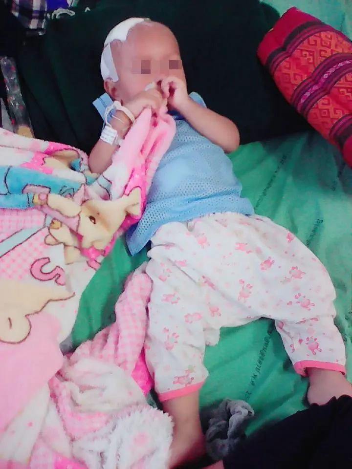อาการของน้องระยะแรก : น้องอาเจียนโดยไม่ทราบสาเหตุ 4-5 ครั้งต่อวัน แต่ยังเดินได้เล่นได้ กระหม่อมเริ่มนูน แต่ไม่มาก