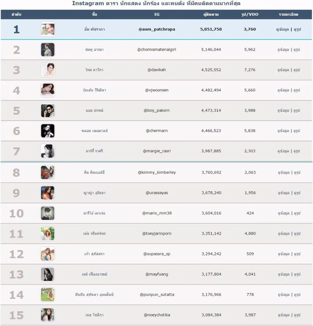 เช็คยอดติดตาม Instagram 15 อันดับแรกของเมืองไทย "อั้ม พัชราภา" ยังคงครองแชมป์อันดับ 1
