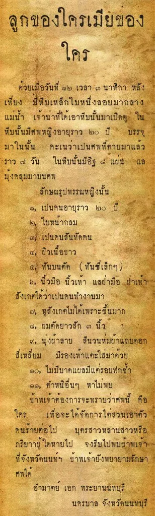ส่วนอันนี้ เป็นข้อความประกาศคนหายในใบประกาศของ พระยานนทบุรีครับ