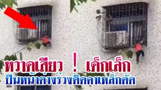 หวาดเสียว!เด็กเล็กปีนหน้าต่างร่วงติดคาเหล็กดัด