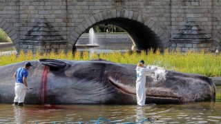 เหมือนจนตกใจ! ซากวาฬยักษ์เกยตื้นแม่น้ำกลางเมืองหลวงสเปน