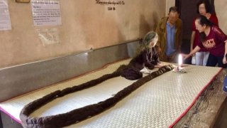 หญิงชราเวียดนาม อายุ 83 ปี ไม่ได้ตัดผมมนานถึง 64 ปี และไว้ผมยาวจนมีรูปร่างเหมือนงูหลาม