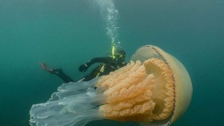 นักประดาน้ำได้ค้นพบแมงกะพรุนขนาดมหึมาขนาดเท่ามนุษย์นอกชายฝั่งอังกฤษ