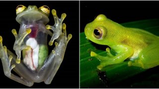 กบแก้ว (Glass frog) ในอเมริกาใต้ มีผิวหนังโปร่งแสง ใสจนมองทะลุเห็นอวัยวะภายในได้อย่างชัดเจน