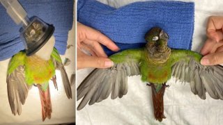 สัตวแพทย์ให้ปีกเทียมนกแก้ว หลังจากเจ้าของตัดปีกของมันจนสั้นกุด