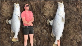 วัยรุ่นหนุ่มออสซี่พบปลาประหลาดตัวยักษ์กลางเขื่อนรัฐควีนส์แลนด์ แล้วลากไปที่ฝั่งด้วยเจ็ทสกี