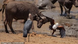 ศึกชิงอาหาร! นกอินทรีนิสัยเสียต่อสู้กับนกกระสาเพื่อขโมยปลาดุก ควายแทบทนดูไม่ไหวขอร่วมแจมด้วยคน