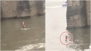 หญิงสาวสุดงง! พบชายแปลกๆแต่งชุดซานตาคลอสเล่นกระดานโต้คลื่นไปตามแม่น้ำใกล้ๆสะพานบรูคลิน (มีคลิป)