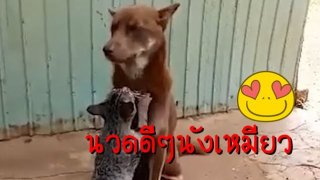 ไม่ค่อยให้มีให้เห็นบ่อยๆ เจ้าเหมียวนวดหน้าอกให้กับสุนัขเพื่อนรัก (มีคลิป)