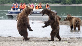 ช่างภาพชาวรัสเซียแบ่งปันภาพถ่ายหมีสีน้ำตาลสองตัวต่อสู้กัน ท่ามกลางสายตาของนักท่องเที่ยว