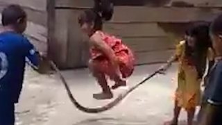 เล่นสนุกสุดแปลก เด็กๆสามคนใช้งูยักษ์ตัวโตเป็นเชือกกระโดด เหมือนการละเล่นพื้นบ้าน (มีคลิป)