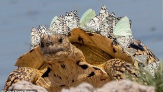 มหัศจรรย์มากๆ เมื่อเต่าเสือดาวยักษ์ถูกฝูงผีเสื้อจู่โจม จนทำให้มันดูคล้ายกับไดโนเสาร์