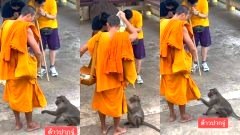เอ็นดู! "เจ้าจ๋อหิว" สะกิดผ้าเหลืองไม่หยุด หลวงพ่อบอกใจเย็นๆ ให้พรยังไม่จบเลย