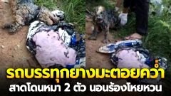 รถบรรทุกยางมะตอยคว่ำ สาดโดนหมา 2 ตัว นอนร้องโหยหวน