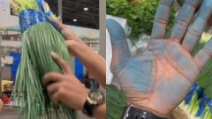 วิจารณ์สนั่น! พ่อค้าฝากถึงผู้บริโภค ลูบต้นหอมโชว์ เจอสีฟ้าติดมือแบบนี้