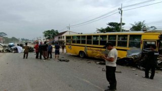สลด! รถกระบะแซงไม่พ้น "พุ่งชนรถนักเรียน" ทำคนขับดับคาที่ บาดเจ็บอีก 8 ราย