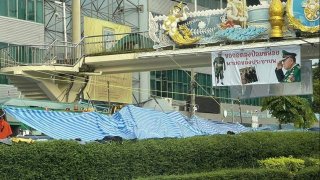 กลุ่มผู้ร่วมชุมนุม "พัฒนาชาติไทย" ปักหลักยึดเกาะกลางถนน พร้อมติดป้ายเชียร์ "บิ๊กป้อม" นายกฯของประชาชน