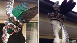 สาวออสซี่ช็อก! งูหลามตัวยักษ์โชว์ห้อยตัวกินนกแก้วตัวเป็นๆ บนรางข้างบ้าน