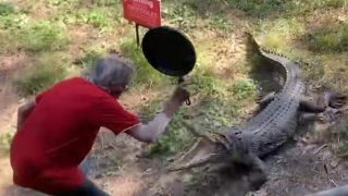 โคตรเทพ!! ชายใจเด็ด ใช้กระทะคู่ใจ สู้กับจระเข้ยักษ์ (มีคลิป)