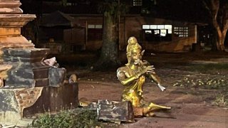 "พระอภัยมณี"นั่งเป่าปี่อยู่ที่ซุ้ม หน้าวัดดีๆ โดนรถบรรทุกชนล้มตึง "ผีเสื้อสมุทร" รอดหวุดหวิด