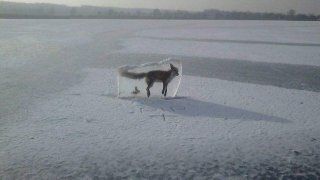 สุนัขจิ้งจอกตัวหนึ่งถูกแช่แข็งในน้ำแข็งในเยอรมนีและถูกนำมาจัดแสดง