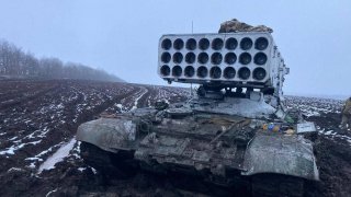 เครื่องยิงจรวดหลายลำกล้องชนิดอัตตาจร ขนาด 220มม. 24 ลำกล้อง แบบ TOS-1A ของรัสเชีย ติดหล่มโคลนในยูเครน ถูกยึดพร้อมจรวดในลำกล้อง