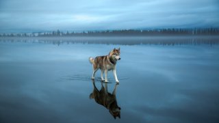 Huskies สองตัวดูเหมือนจะเดินบนน้ำข้ามทะเลสาบที่เป็นน้ำแข็ง
