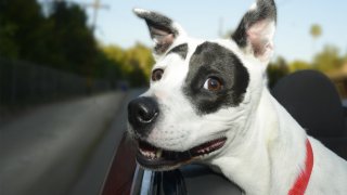 สุนัขยื่นหัวออกจากหน้าต่างรถและเพลิดเพลินไปกับทิวทัศน์
