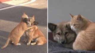 สุนัขและแมวปลอบโยนซึ่งกันและกันหลังจากถูกทอดทิ้ง พวกเขายังคงรอครอบครัวของพวกเขาในจุดเดียวกัน