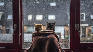 ช่างภาพถ่ายภาพแมวที่น่ารักของเธอตรงหน้าต่างเมื่อฝนตก