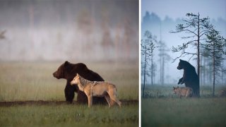 ช่างภาพจับภาพมิตรภาพที่ผิดปกติระหว่างหมีและหมาป่า