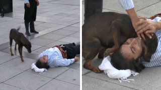 สุนัขจรจัดขัดขวางการแสดงเพื่อปลอบใจนักแสดงที่แกล้งทำเป็นได้รับบาดเจ็บ