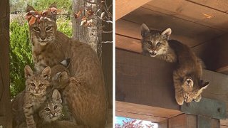 ครอบครัว Bobcat ที่น่ารักกำลังหนาวสั่นอยู่ที่ระเบียงด้านหน้าของเธอ(VDO)