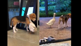 รักกันสุดๆ! กับภาพความอบอุ่นระหว่างเป็ดกับสุนัข ที่กำลังยืนกอดกันอย่างมีความสุข (มีคลิป)